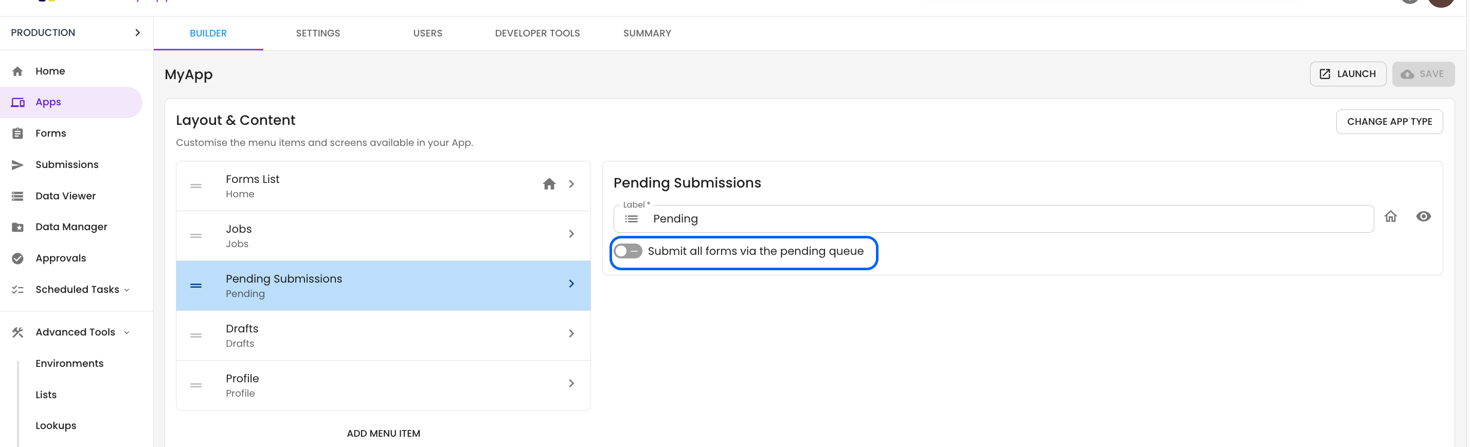 The pending queue can be accessed from the app menu. It will store any submissions that are completed while offline or while on a poor internet connection. The pending queue displays the list of pending forms, the date and time they were submitted, and any attachments that need to be uploaded.