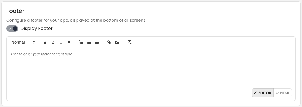 The footer configuration will allow you to add a page footer to the bottom of each of your form and app pages. This will enable you to meet your styling guidelines by including any custom text and links at the bottom of each app page.