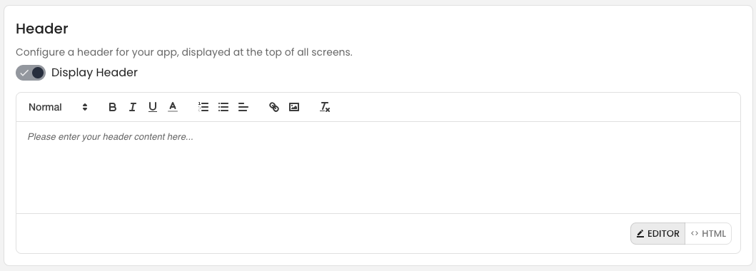 The Header configuration will allow you to add a page header to the top of each of your form and app pages. This will enable you to meet your styling guidelines by including any custom text and links at the bottom of each app page.