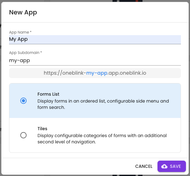 This is where you can change between a form list app and a tiles app. For more on this, check out the Create an App section above.