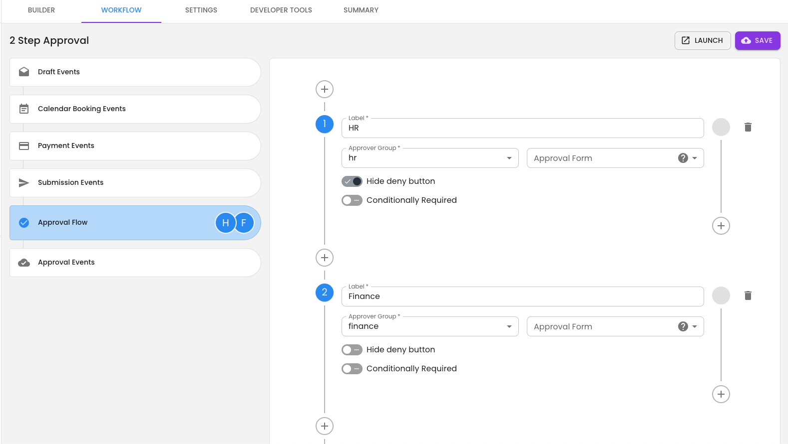 Steps can also be set to trigger conditionally based on the form submission, meaning that you only want an approval step to be required when specific conditions are met. You can configure that using the conditional logic configuration on that step.