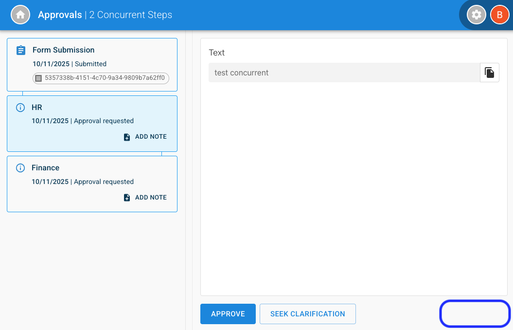 Clarifications are an important part of approval flows, allowing approvers to send the submission back to the original submitter to fix any issues there may be with the submission.